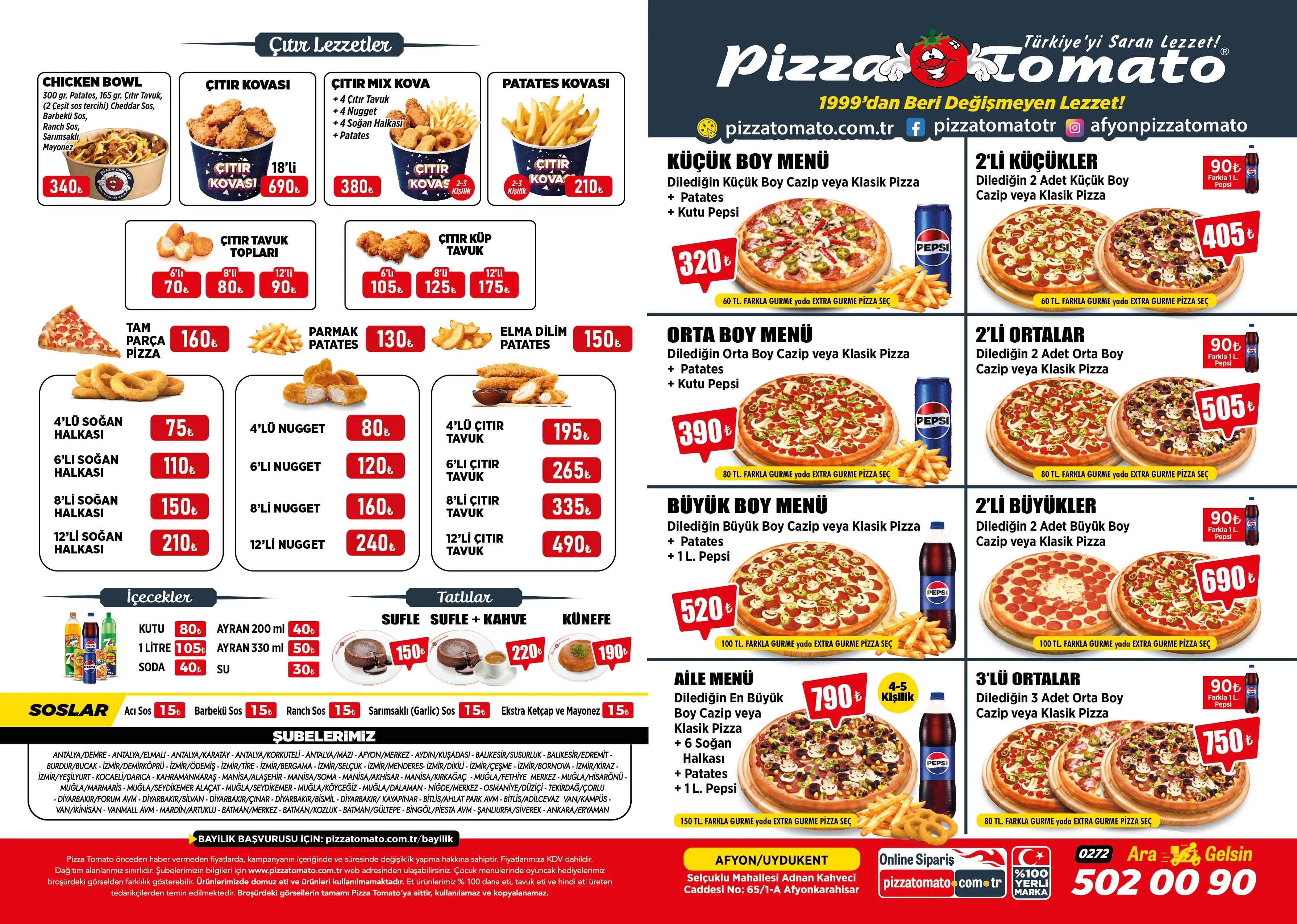 Pizza Tomato Afyon Şubesi'nin birbirinden lezzetli kampanyalı menülerine ulaşmak çok kolay, hemen sipariş ver, pizzan kapına gelsin. Pizza Tomato Afyon Şubesi'nin güncel fiyatlarını içeren e-broşürü aşağıdadır.