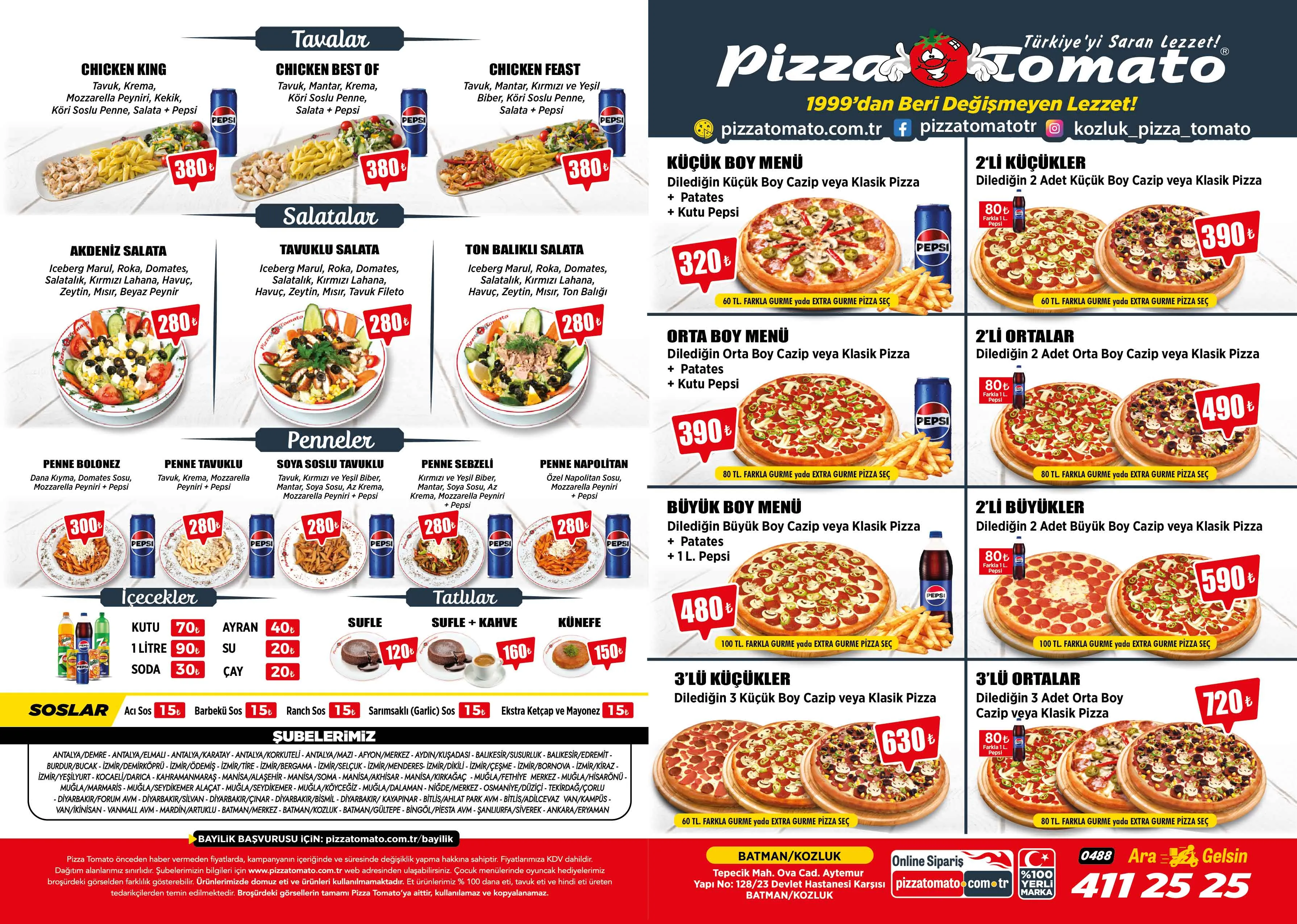 Pizza Tomato Kozluk Şubesi'nin birbirinden lezzetli kampanyalı menülerine ulaşmak çok kolay, hemen sipariş ver, pizzan kapına gelsin. Pizza Tomato Kozluk Şubesi'nin güncel fiyatlarını içeren e-broşürü aşağıdadır.
