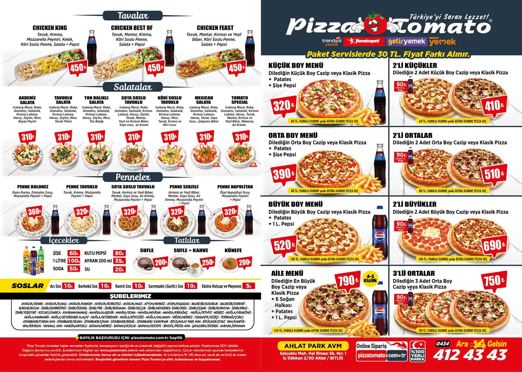 Pizza Tomato Ahlat Şubesi'nin birbirinden lezzetli kampanyalı menülerine ulaşmak çok kolay, hemen sipariş ver, pizzan kapına gelsin. Pizza Tomato Ahlat Şubesi'nin güncel fiyatlarını içeren e-broşürü aşağıdadır.