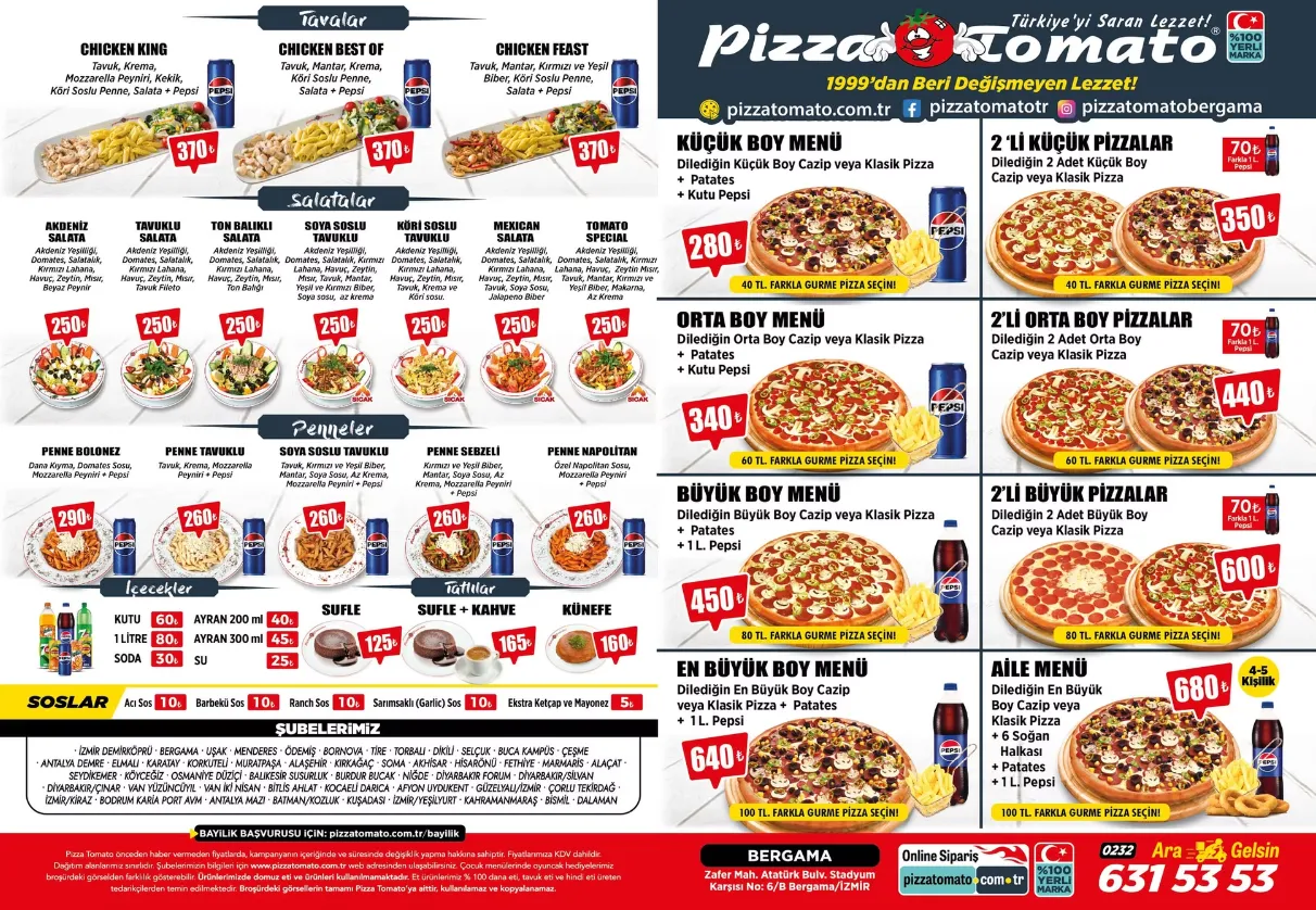 Pizza Tomato Bergama Şubesi'nin birbirinden lezzetli kampanyalı menülerine ulaşmak çok kolay, hemen sipariş ver, pizzan kapına gelsin. Pizza Tomato Bergama Şubesi'nin güncel fiyatlarını içeren e-broşürü aşağıdadır.