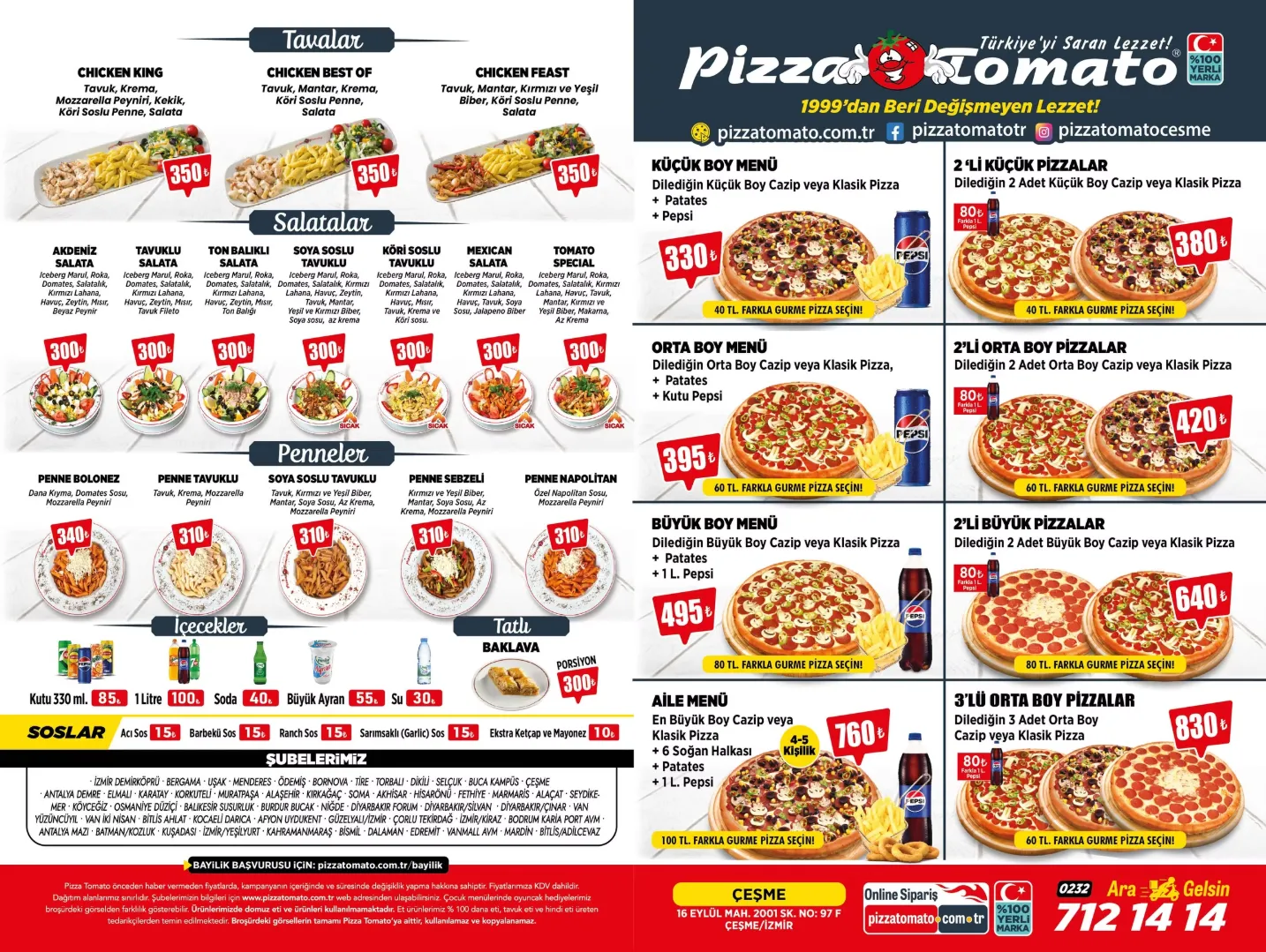 Pizza Tomato Çeşme Şubesi'nin birbirinden lezzetli kampanyalı menülerine ulaşmak çok kolay, hemen sipariş ver, pizzan kapına gelsin. Pizza Tomato Çeşme Şubesi'nin güncel fiyatlarını içeren e-broşürü aşağıdadır.