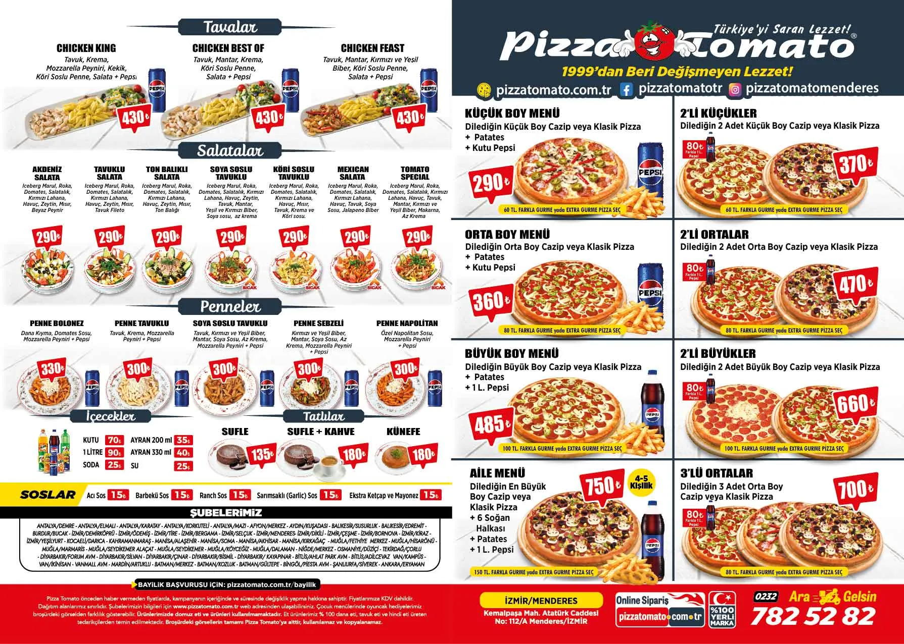 Pizza Tomato Menderes Şubesi'nin birbirinden lezzetli kampanyalı menülerine ulaşmak çok kolay, hemen sipariş ver, pizzan kapına gelsin. Pizza Tomato Menderes Şubesi'nin güncel fiyatlarını içeren e-broşürü aşağıdadır.