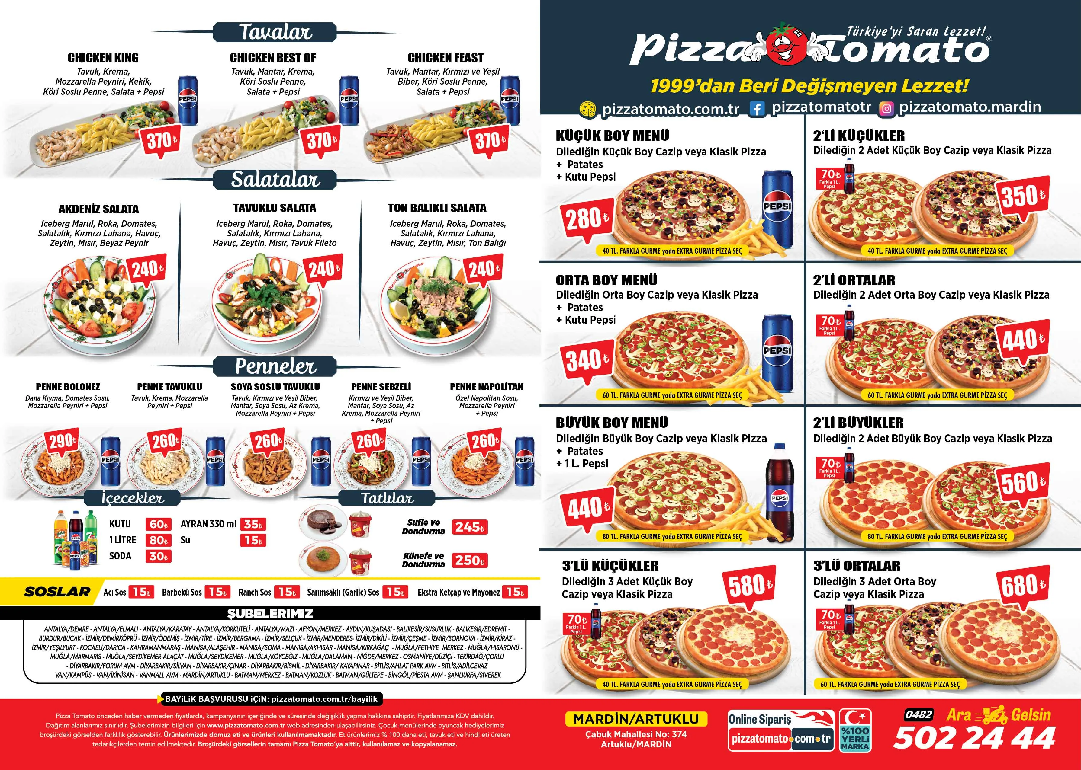 Pizza Tomato Mardin Artuklu Şubesi'nin birbirinden lezzetli kampanyalı menülerine ulaşmak çok kolay, hemen sipariş ver, pizzan kapına gelsin. Pizza Tomato Mardin Artuklu Şubesi'nin güncel fiyatlarını içeren e-broşürü aşağıdadır.