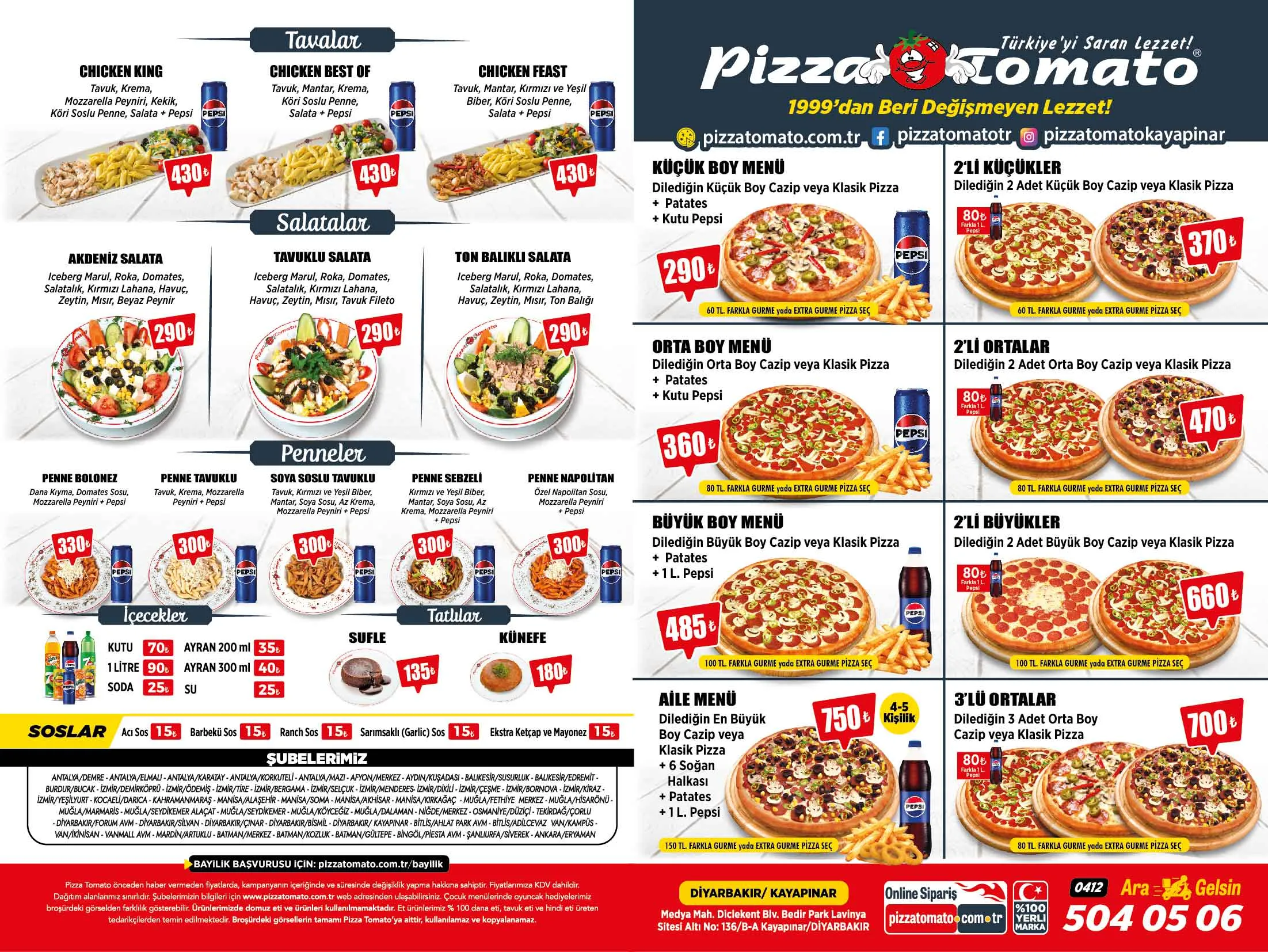 Pizza Tomato Kayapınar Şubesi'nin birbirinden lezzetli kampanyalı menülerine ulaşmak çok kolay, hemen sipariş ver, pizzan kapına gelsin. Pizza Tomato Kayapınar Şubesi'nin güncel fiyatlarını içeren e-broşürü aşağıdadır.